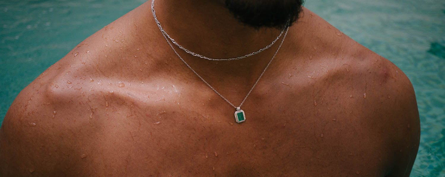 The Malachite Pendant necklace features a striking emerald-cut green stone, offering a bold yet refined statement perfect for layering or wearing solo.